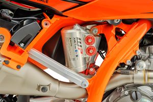 WP’s 48 mm cone valve fork features a shim-less design with a 310 millimeter stroke and 23 millimeter piston diameter, offering a wide range of tuning options to suit rider size, skill, and terrain. The matching WP rear shock complements the fork perfectly, ensuring maximum traction and stability across varying track conditions while maintaining balanced handling.
